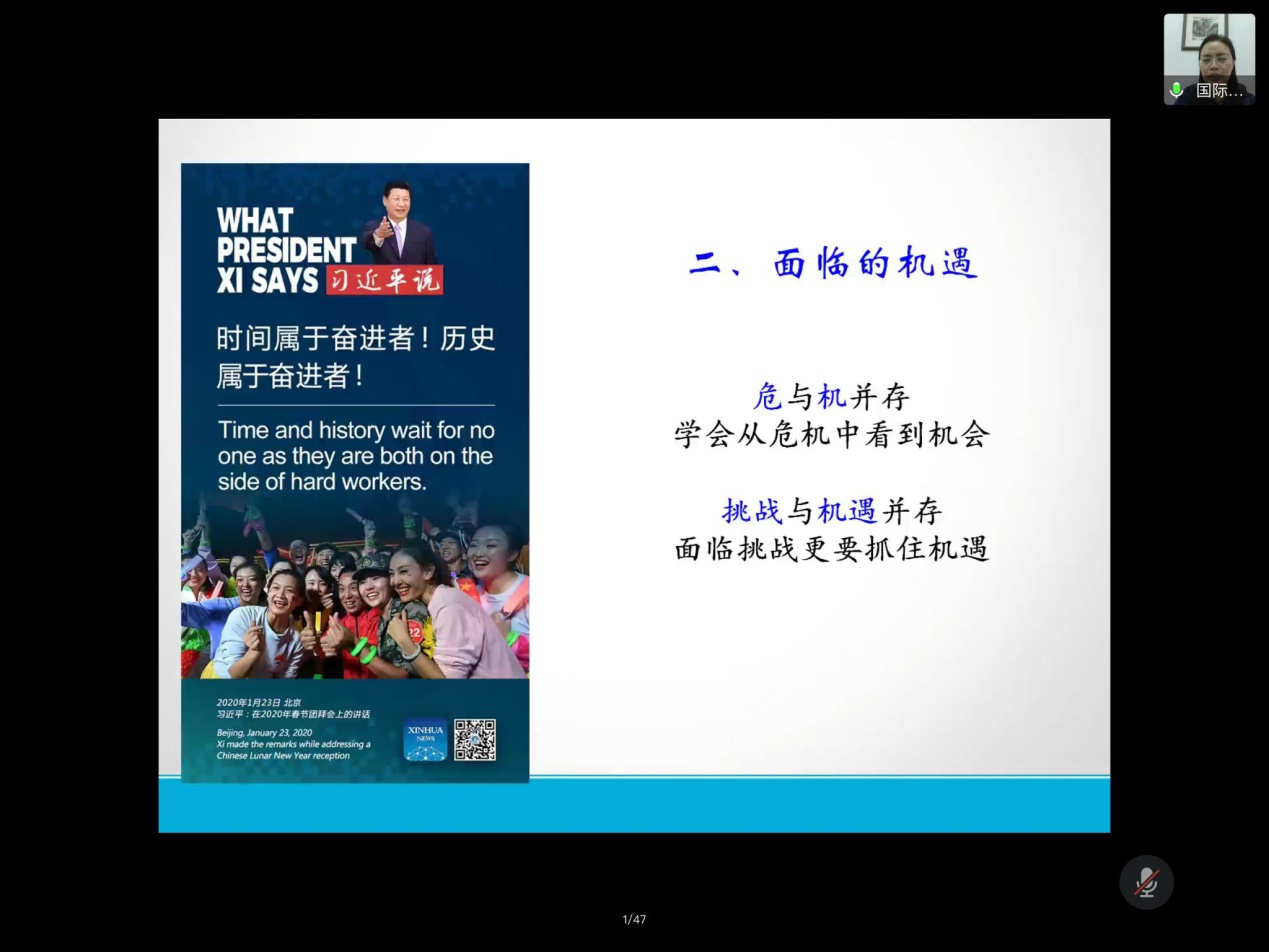 会议伊始,王智对疫情下royal皇家88平台的海外师生们的共克时艰表示肯定,学生们在国际交流处的积极指引下平安返淮。她表示,疫情下的我们依然有着多种机遇,而在机遇的背后,仍面临着新形势和新挑战,我们应稳妥面对此次大变局并牢牢把握这次机遇。她以“中国需要了解世界,世界需要了解中国”引出目前世界和中国的开放关系,并结合自身在英国留学时的所见所闻所感,向同学们展现了出国留学的意义和价值。出国留学,不仅仅是学术上的一次提升,更是一次培养全球视野的好机会,能够了解到不同国家、民族的文化,提升自身素养。最后,王智还呈现了royal皇家88平台目前的国际化办学机制,表示其一直遵循“抓机遇、补短板、创特色”的办学理念,积极做好国际交流与合作,取得了良好的办学效果。