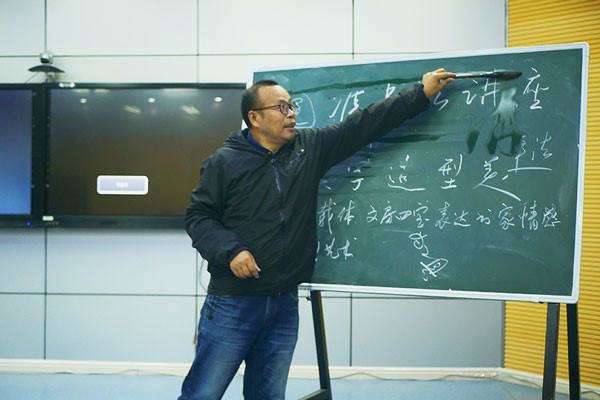 刘淮教授从一个中心、两个基本点、十大关系三方面展开具体讲解,将汉字理论与现代社会生活相联系,生动形象地传授在场学生汉文字知识。他提出“笔法是书法的核心,节奏是书法的生命”,并倡导学生多观摩、多临帖,通过学习前人优秀的书法作品,感知其中所蕴含的书法知识,从而有效提高自身的书法水平。