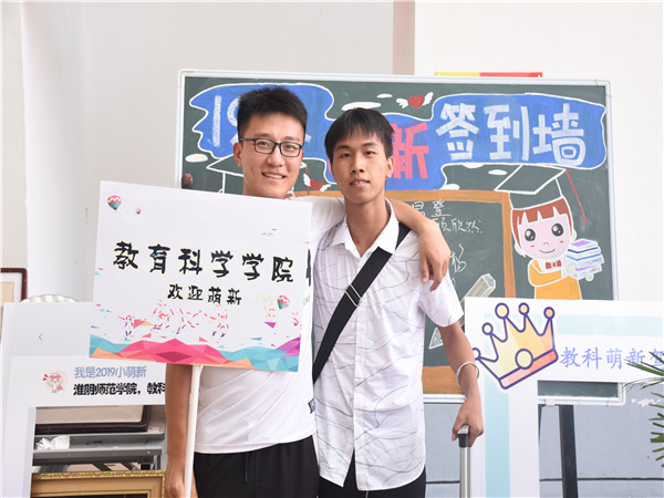 四名学前男生相约齐报道,成了学前专业迎新一道靓丽的风景线。得知学前专业男生的稀少在教科院“小有盛名”,他们说笑道:我们成了学前国宝。据悉,教科院今年招收新生人数是淮师之最,淮师文、理科语文最高分(江苏卷)也出自教科院。一只长镜头穿梭在迎新现场,这是学院为新生拍摄的vlog,记录着他们第一次踏入淮师的身影。镜头里捕捉到一位高鼻梁的新疆女孩,她推着行李额头上渗出密密的汗,当问到对于淮师的初印象时,她青涩的笑道:淮师校园比她想象中的要大多了、美多了!