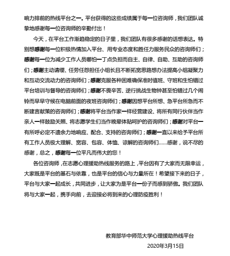 采访最后,昌老师谈了自己的感想:疲尽春归会有时,静待花开赤子心。2020的寒冬,让所有人的心连到了一起。感谢教育部华中师范大学心理援助热线平台,让我们有机会在这次战“疫”里充分发挥自己的心理学知识、技能与经验,为救助他人贡献自己的力量。我们共同坚守,不论日夜,无惧风雨;不忘初心,守望相助。这些勇毅前进的脚步,相伴同行的感动,必将交织成华夏大地最动人的乐章。向所有在热线上默默付出的人致敬!