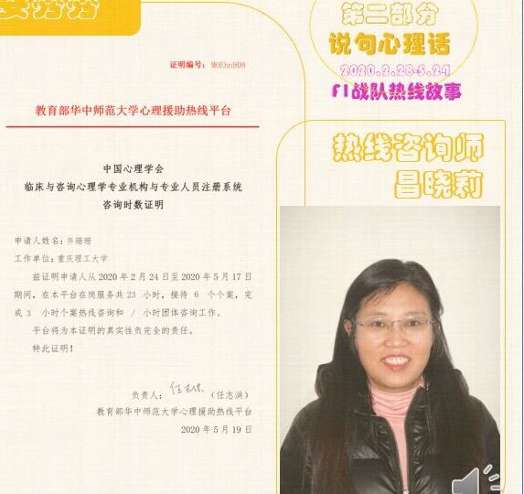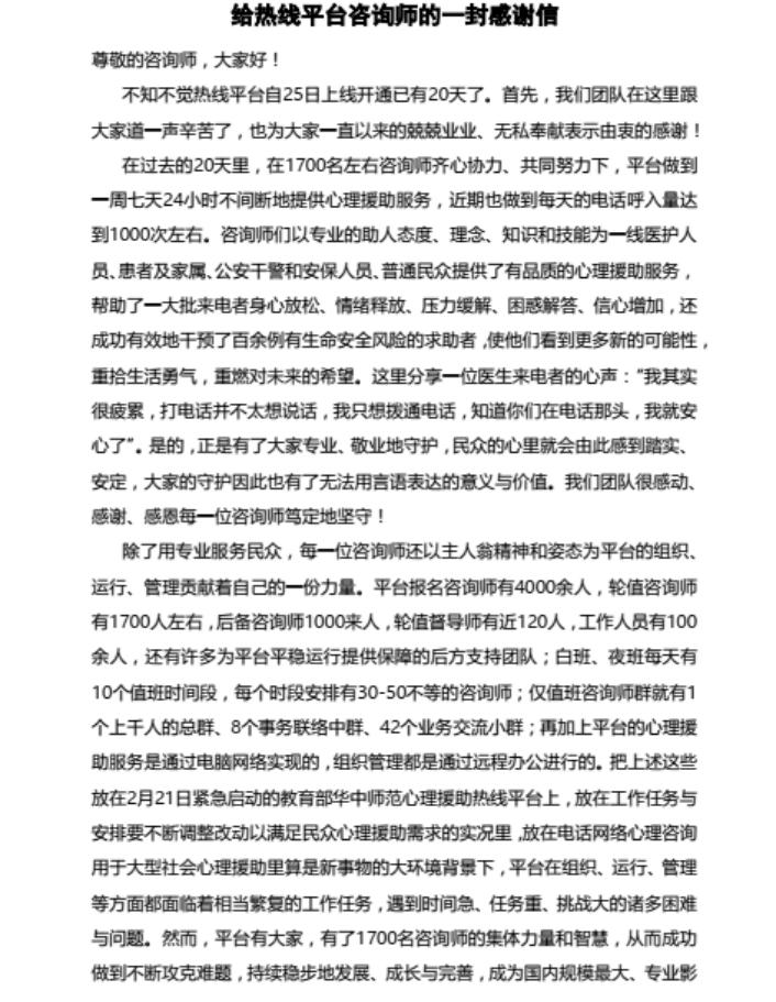 由于线上咨询存在无法通过表情判断咨询者是否稳定的局限性,昌老师利用空余时间不断加强理论学习,便于更好地掌握咨询者的实际情况。昌老师任劳任怨,不畏辛劳,仔细聆听,耐心疏导,给有需要的人提供了一个心灵的港湾。对于参加此次援助项目的感受,她用三个词进行了概括:激动、幸福、不舍。为在疫情期间,能为国家做贡献而激动;为能运用自己的专业知识,帮助更多人疏导情绪而幸福;对共同投身心理咨询服务、互帮互助的同行们感到不舍。