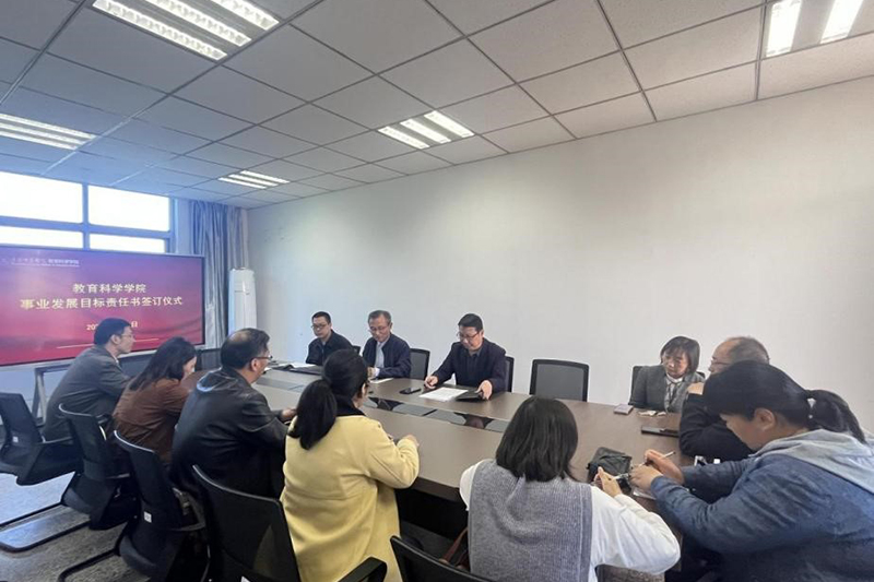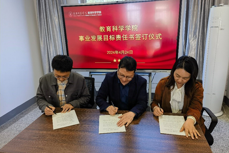 教科网4月25日电(记者 曹琪敏)4月24日下午,教育科学学院2024年事业发展目标责任书签订仪式在1-409举行。签订仪式由曹如军院长主持,全体院领导、四个学系主任和书记参会。曹如军院长首先组织参会人员学习了《教育科学学院2024年任务分解表》,分析了学院2024年工作重点任务,就制定2024年目标责任书作出了说明,并对任务的落实进行部署。