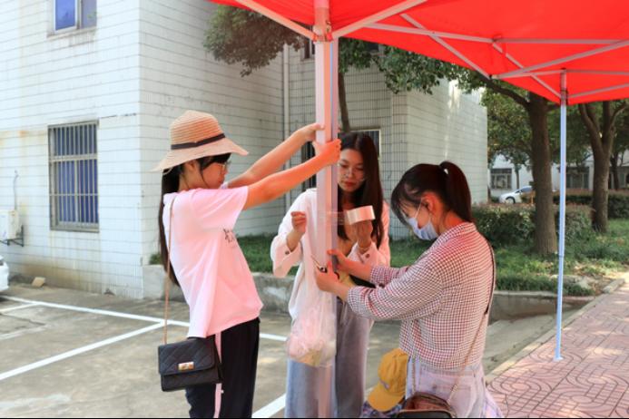 9月11日下午,志愿者们积极做好迎新服务点的布置工作,等候2020级小萌新们的到来。