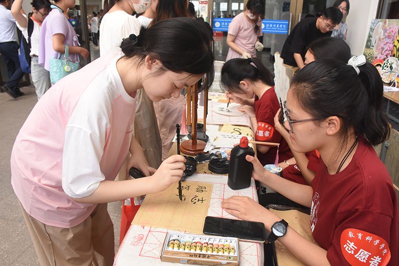 交流专业技艺,继承文化传统。教科院的迎新活动不仅是一次简单的迎接仪式,更是一次学生专业成果的展示。十余张展板全面生动地展示了学院的办学历史、发展现状和育人成果;书画作品让萌新们看到了“明天的我”;手绘班牌以及现场创作的书法折扇和绘画,让新生一见倾“新”。志愿者们独具创意,纯手工与新生一起制作的非遗漆扇精妙绝伦,现场古筝声响起,委婉动听。“古筝雅韵,漆扇传情”,旨在通过传统文化的展示,为新生们带来了一场视听盛宴。专属的“未来可期”百事可乐让新生带着梦想和希望起航。在文化互动与心灵交流中,让每一位新生感受到了教科院大家庭的独特新意与无限创意。这些活动不仅展现了教科院学子的专业素养和创意才华,也让新生们感受到了学院独特的艺术魅力和文化底蕴。