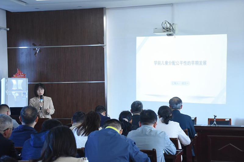 活动伊始,程天一分享了她对学前儿童分配公平性早期发展的研究。她从理论变迁、发展特征和影响因素等方面阐述了该领域的研究现状,并明确提出了自己的三个研究目标,同时针对这些目标制定了实际可行的研究方案。