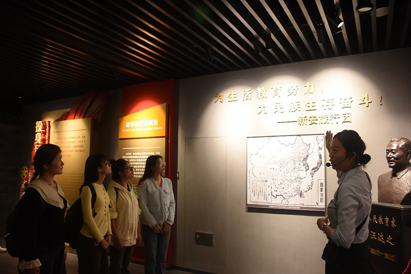 其次是感悟“新旅”的教育风范。十七年风云岁月里,在战火纷飞的年代,新安旅行团不怕艰苦,足迹遍及大半个中国,以文艺为武器,唤起民众抗日救亡,宣传党的主张,展现了爱国奋进的精神风貌。在没有固定校舍、没有现成教材、没有专门教师的情况下,他们实践独特的“小先生制”和“民主生活会”,培养出一大批政治、军事、科技、文艺等众多领域的杰出人才。陶行知在给汪达之的回信中提到:“捧着一颗心来,不带半根草去,你们抱着这种精神去教导小朋友,总是不会错的。”