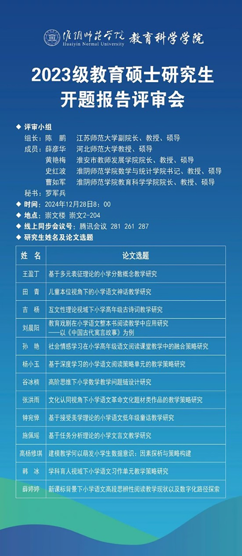 教科网12月30日电(记者 刘晨阳)2024年12月28日,我院2023级硕士研究生毕业论文的开题报告评审会在崇文楼2—204室举行。此次开题报告评审旨在检验同学们入学以来的学习成果,明确研究方向与思路,为未来的科研工作奠定坚实基础。本次评审专家小组阵容强大,由河北师范大学薛彦华教授、江苏师范大学副院长陈鹏教授、淮安市教师发展学院院长黄艳梅教授、royal皇家88平台数统学院史红波书记和royal皇家88平台教育科学学院院长曹如军教授五位资深专家组成。他们凭借深厚的学术造诣和丰富的实践经验,为开题报告提供了专业指导和宝贵建议。