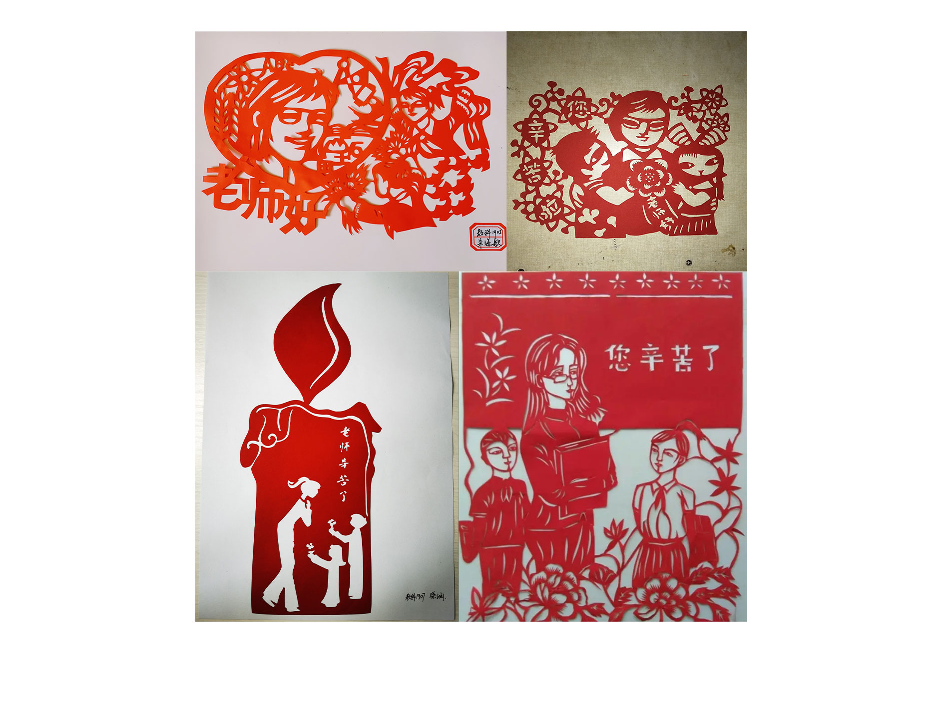 师者,恒守初心;学子,常怀感恩。同学们用灵巧的双手传达了诚挚的祝福。1913的金家顺同学借助剪纸向老师表达敬意。一个小小的手工作品,饱含了同学们对老师浓厚的情谊。剪纸、泥塑、贺卡等创意手工作品都富于创新,设计独特,手写手绘,讲究细节,制作精美,使人眼前为之一亮。