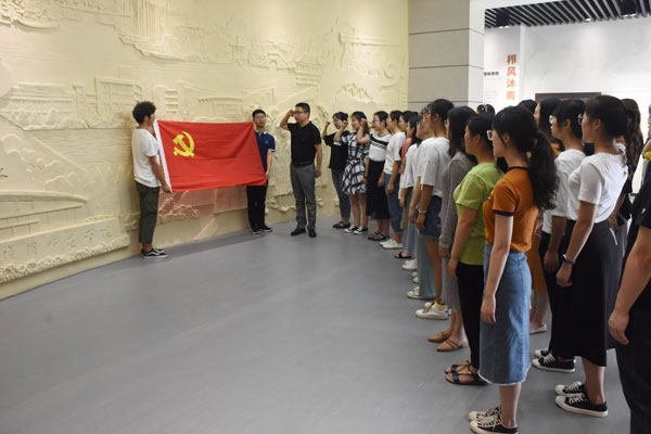 在周恩来精神教育基地,戴云带领党员们进行宣誓,鲜红的党旗,简而有力地渲染出庄严的气氛。现场响起激昂的宣誓声,每个同学都用发自内心的声音抒发对党忠诚的决心,短短几十字的誓词是他们入党后对党的承诺。戴云表示,希望毕业生们将入党誓词内容真正践行到日常生活中,从中提取正能量,以优秀学长学姐为榜样。15级学生代表陈华、16级学生代表余星怡进行发言,他们讲述参观校史馆的感受,表明发扬淮师人精神的决心。