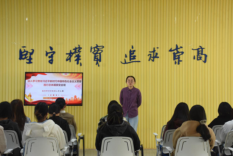 教科网4月2日电(记者 何沁)为贯彻落实习近平新时代中国特色社会主义精神,加强国家安全观念教育,4月2日下午,教育科学学院学生第二党支部在26号楼大学生一站式服务中心召开“深入学习贯彻习近平新时代中国特色社会主义思想,践行总体国家安全观”的专题党课。本次党课由教育科学学院学生第二党支部书记潘架丹老师主讲,支部全体党员共同参与。