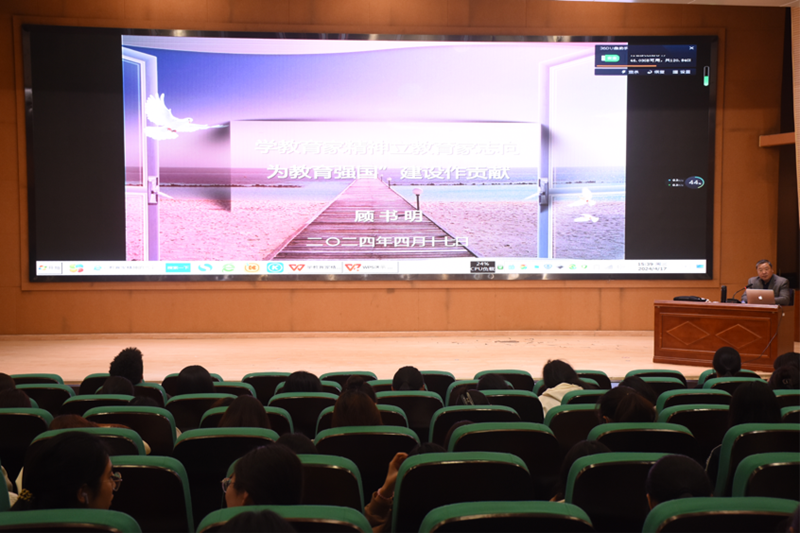 顾书明首先带领同学们理解了“教育家办学”“教育家精神”的内涵,他指出教育家办学的核心是建设教育强国必须按照教育规律办事,尊重教育领导的专业特性,且教育家办学是我国教育高质量发展的需要,是办人民满意的学校的需要。此外,他结合身边教育家的例子,突破了同学们对教育家狭隘的认识。随后,着重强调了习近平所提的“教育家精神”的六个维度,他认为教育家精神的意义在于可科学的培养和引导学生发展、有力影响社会和文化的进步并有效塑造美好的教育环境。最后,顾书明希望同学们能够争当教育强国先锋,争学教育家精神,认真学习和实践,持续探究和创新,勇于担当和奉献,为事业和人生的发展奠定良好基础,为推动社会发展进步积蓄力量,主动肩负起教育强国建设者的使命责任。