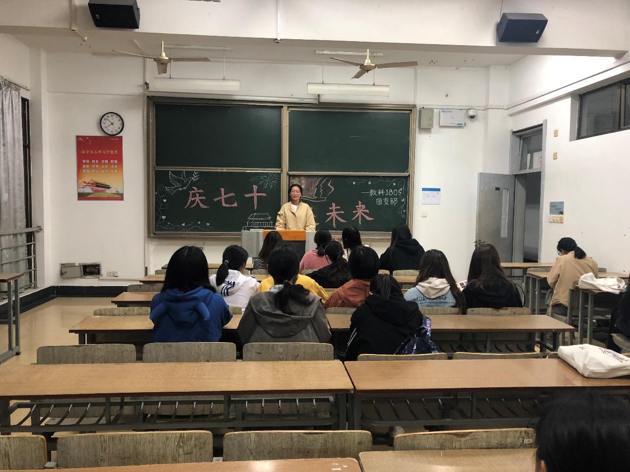 教科网10月23日电(记者 宋文怡 沈雅雯)今年的十月一号,是新中国成立七十周年,盛大的阅兵仪式在天安门广场举行,这场空前盛世展现了新中国成立七十周年来产生的翻天覆地的变化。无数的中华儿女守在电视机前观看阅兵仪式直播,他们一定是内心激动无比,自豪无比,喜悦无比。当然,作为中华的新鲜血液的大学生也是。为庆祝祖国华诞,教科1805团支部在10月14号在崇文楼1—107教室开展以“庆七十,展未来”为主题的团日活动。