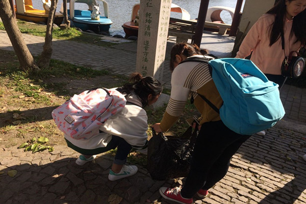 紧接着,团支部来到勺湖公园。公园入口处,便是一条左右相通的回廊,两边绿丛萦绕,绿树环绕着波光粼粼的勺湖,清风微抚,阳光和煦。顺左径拾级而上,一口古老而厚重的铜钟巍然而立。成员们在入园后四散开来,在各处捡扫落叶、垃圾,进行志愿服务活动。此外,支部成员自发搜集周恩来相关书籍,进一步品读和体会恩来的伟大精神和感人事迹。