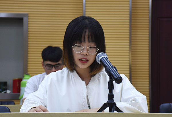 黄馨漪从答辩环节分享自己的收获,从才艺展示环节做出反省。她认为答辩角度、文稿准备和幻灯片展示是答辩过程中的加分项。汇报人需要足够的自信,选取合适且吸引评委老师的答辩角度进行答辩。幻灯片的内容要丰富,文稿准备时要注意整体感和文末的情感升华,所举事例能够引起评委老师的共鸣,用校级及以上奖项等荣誉为班级增彩。她表示班级在才艺展示环节相比其他班级缺少凝聚力,应注重班级特色的展现,在创周过程中加强班级凝聚力。