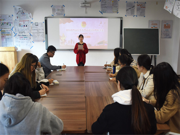 会上,顾伊荻组织学生代表们集中观看纪念五四运动一百周年大会直播,认真学习五四精神,结合自身学习工作实际,发表自己的感受。顾伊荻表示:“五四运动中充满的爱国主义精神和倡导的民主、科学精神,构成五四的优良传统,这种传统犹如接力棒,为中国青年一代又一代地传递着。发扬五四精神对于当代大学生有着重大意义,当代青年担当着建设社会主义现代化,振兴中华的历史重任。青年们应谨记习近平总书记教导:“我们新时代中国青年要树立远大理想,要热爱伟大祖国,要担当时代责任,要勇于砥砺奋斗,要练就过硬本领,要锤炼品德修为”。党员代表1705班刘畅表示:“作为一名党员,我应当充分发挥自己的作用,做一名奋进者,开拓者,实事求是,从身边的小事做起,从点滴做起,为人民服务。应当积极响应党和国家的号召,作为新时代的青年,要有远大理想抱负,怀揣深厚家国情怀,怀一颗赤诚之心,投身新时代党的领导建设中,为国家做贡献。”志愿者代表1802班杨龚悦表示:“作为一名志愿者,我们更应在学习、工作上坚持以高标准、高要求规范自己的言行,全心全意为同学服务,努力帮助同学们营造更好的学习氛围和学习环境,在每次的志愿活动中,真正把先进的奉献意识与诚恳的服务态度落到实处。”少数民族学生代表1809班姜妍臻表示:“作为一个少数民族青年,在五四运动过去的一百年里,我深切感受到党和国家对我们的关爱。我们应该紧跟党走,积极爱国,应当树立关乎自身前途、国家前途的远大理想并为之不懈奋斗。热爱祖国热爱党,不忘跟不忘本。珍惜时代、负重前行,担当起自己的时代责任。努力成为一名有理想,有担当的有志青年。”学前专业学生1707班张昌宇表示:“我现在就读学前教育专业,未来也会走上教学育人的道路,我更加感到身上的责任重大,感到工作意义的深远。通过观看直播,我了解到新的时代赋予五四精神以‘解放思想,与时俱进,开拓创新,勇于奉献’的新生命力。作为当代青年,我们必须以此为动力,抓住机遇,勇于改革,破除一切阻碍社会进步的因素,为建设社会主义和谐社会而努力奋斗。”学生干部代表1709班金鑫鑫表示;“时代在发展,社会在进步,五四精神也在不断的丰富和发展。作为学生干部,我们应该努力实践‘求知、求真、求实’的校训,以“与人为善,善待人生”为处事做人的原则。牢记求真务实以学为本,踏踏实实一丝不苟,始终保持积极进取的精神状态,把实事办好,把好事办实。”