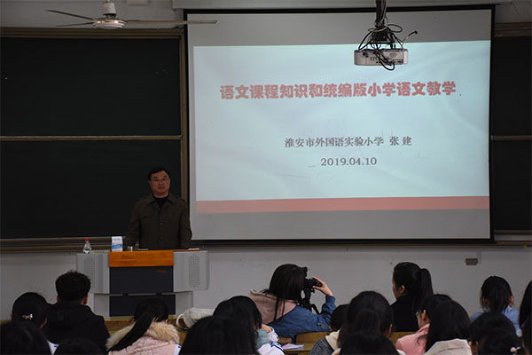 教科网4月10日电(记者 沈明洁 邵静娴)为拓宽小学教育专业学生对小学语文学科的认识和理解,更多的接触到小学语文前沿性知识。4月10日下午,教科院邀请淮安市外国语实验小学副校长、小学语文特级教师张建于崇文阶103开展主题为“语文课程知识和统编版小学语文教学”的讲座,17、18级小学教育专业学生参加讲座,讲座由教育学系主任任红娟主持。