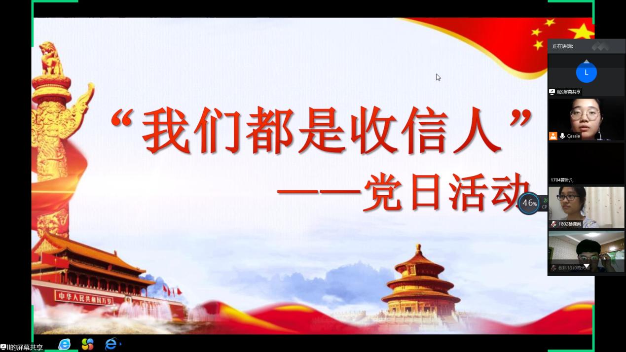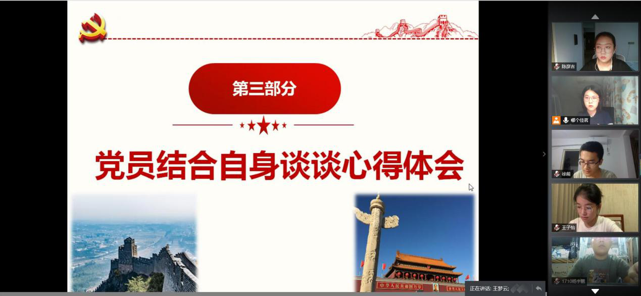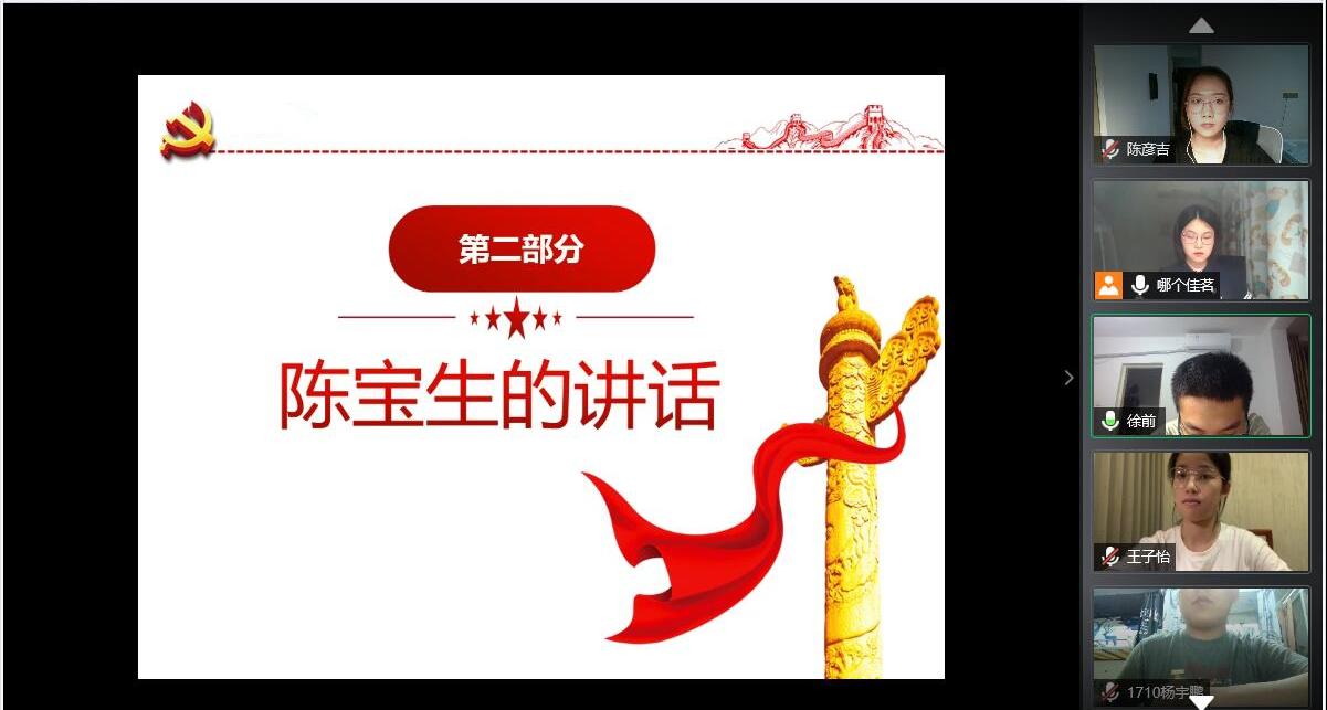 学生第一党支部书记章佳茗通过腾讯课堂将《习近平回信勉励北京大学援鄂医疗队全体“90 后”党员让青春在党和人民最需要的地方绽放绚丽之花》完整诵读了一遍,督促大家学习陈宝生部长的讲话,并在接下来的时间中鼓励大家开麦谈一谈对“把理想信念作为思想行动的‘总开关’”、“把爱国情怀作为成长成才的‘定盘星’”等六个观点的理解。