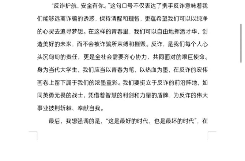 在征文活动中,同学们围绕“反诈智慧”“反诈预警”等主题展开论述。他们结合身边发生的真实案例,深入浅出地分析了各种安全隐患及其可能带来的严重后果,同时提出了切实可行的防范措施和建议。同学们的征文思路多样清晰,主题明显,对反诈的要求,做法一一论述,更好地反映反诈的重要性。