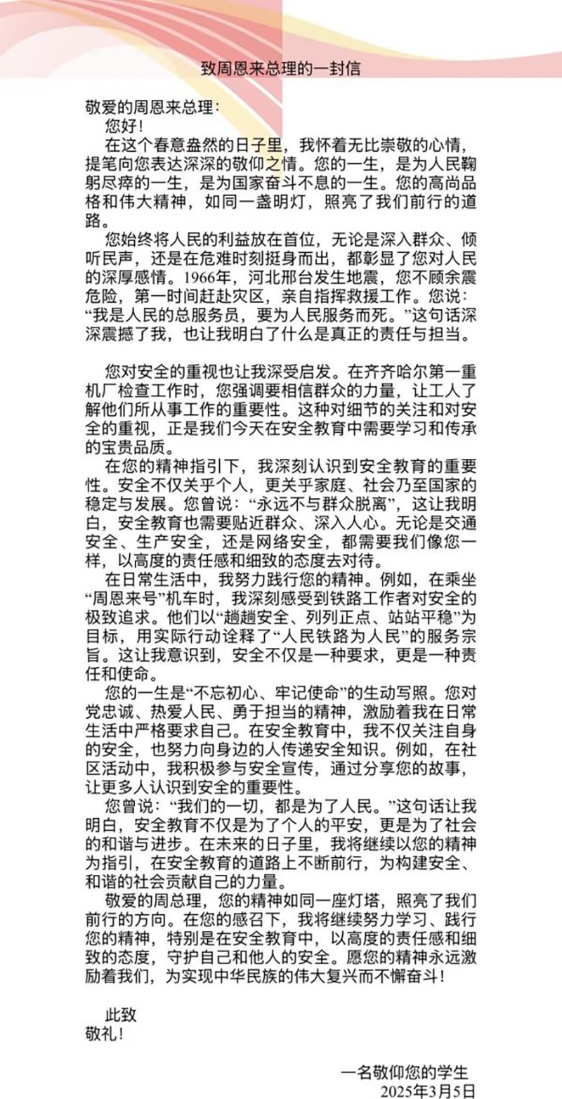在书信活动中,教科2305石歆颖同学的书信,字字句句中流露出对总理的敬仰,并且融入了自己对安全教育的理解。