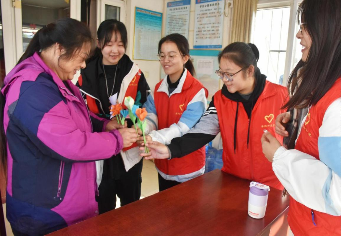 11月13日下午,团队成员集中制作手工作品,做好准备工作。本次活动中,“槐青”志愿服务团队拜访在校工作的叔叔阿姨,送上精心准备的手工作品,并表达诚挚的祝福与感谢,工作人员在与志愿者们的亲切交流中度过了一段轻松而愉悦的时光。