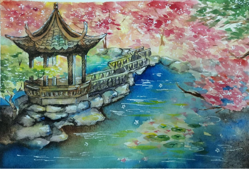 图为时敏莉同学作品《春亭湖景》。记者 高境 摄