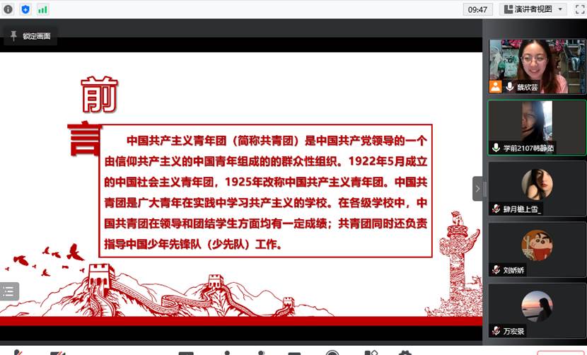 本次公开课以线上会议的形式开展。活动开始,团支书蔡欣芸向同学们介绍中国共青团建团历史,让同学们认识共青团的发展及所担使命。同时,同学们发表自己的感想,团员进行思想感悟,体会其中的责任感与使命感,通过介绍如何践行群众路线,组织团员学习群众路线是团的生命线,共青团员是团的基石,表示团员要先行敢为勇承担,提高青年团员的思想觉悟,加深对习近平新时代中国特色社会主义思想的理解,增进对习近平总书记的思想认同和行动追随。