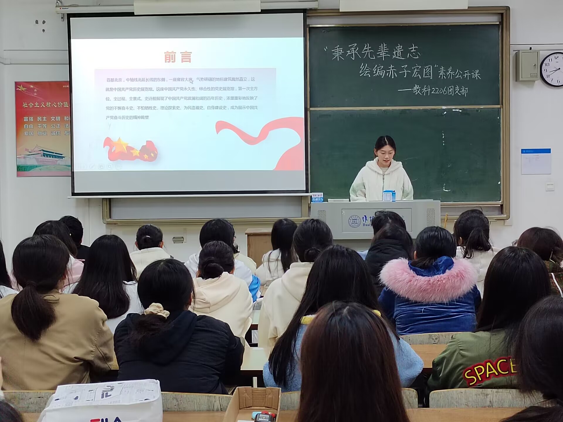 教科网11月28日电(记者 蔡欣芸 葛禹含)为学习贯彻好党的二十大精神,厚植广大团员青年爱党、爱国、爱社会主义的情感,引导团员青年坚定不移跟党走,积极投身于我国全面建设社会主义现代化国家新征程,2022年11月23日,教育科学学院2206团支部开展了以“秉承先辈遗志,绘编赤子宏图”为主题的素养公开课。