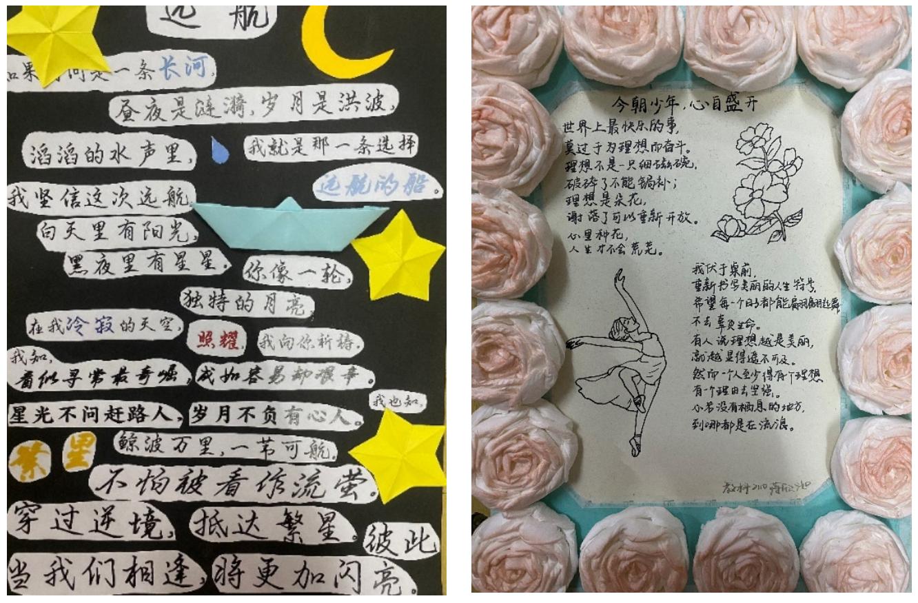 活动前期,同学们积极报名参加比赛。在作品制作环节中,同学们以“立志有德,流光溢'才'”为主题进行拼贴诗创作,发挥想象,精心设计,认真构思诗歌框架,并用各式各样的装饰物创新性点缀了最终的纸质稿作品,借此表明个人志向和理想,彰显了教科学子的才思与情思。随后,部门干事及时收集了同学们的参赛作品,并邀请了相关专业人员参加作品评选。