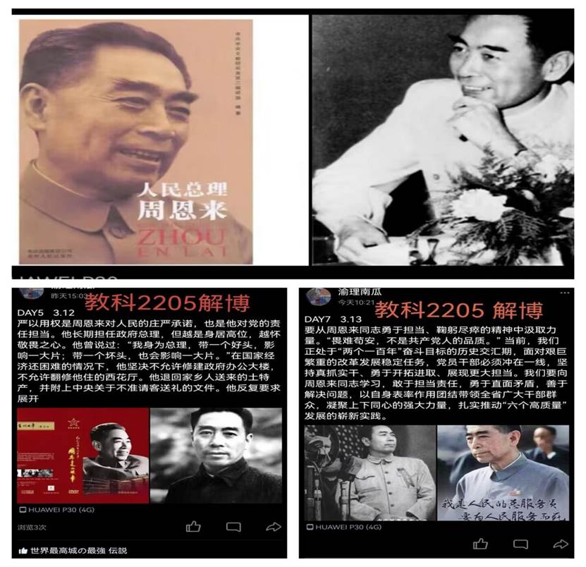 本次活动由三个部分组成。第一部分是“以诵传情”,该部分要求同学们借助网络、书籍等搜集关于周总理的资料并制作成PPT进行分享然后拍成视频。进行分享的同学要求口齿清晰、声情并茂、PPT精美,言语间饱含对周总理深深的爱戴之情。