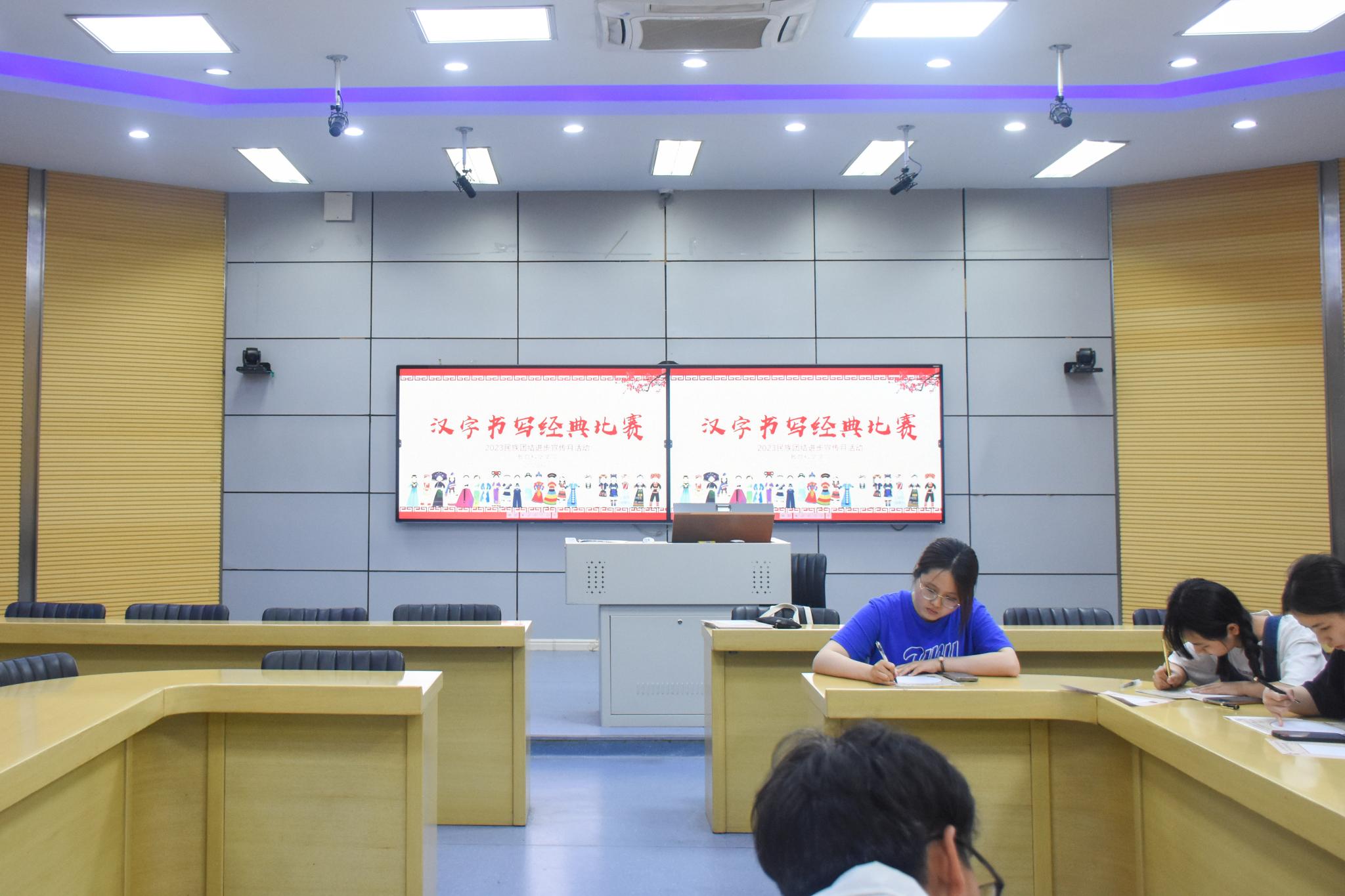 比赛伊始,张胥燕为每位参赛同学分发了比赛专用纸,并公布书写比赛内容:周恩来总理的《无题》与习近平主席的《寄语青年》。她指出,本次比赛以“民族团结进步”为主题,以文字的规范和美观为评判标准,比赛结束将择优推荐优秀作品至学校参赛。
