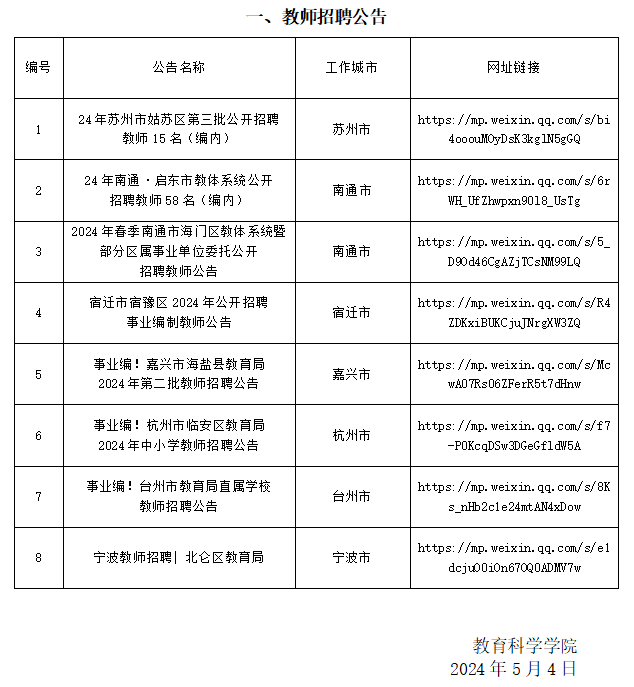 教育科学学院2023-2024学年第二学期第11周招聘信息