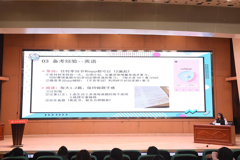 吴苏蕾从院校选择、考研规划和考研心态三个维度分享了自己的考研之路。她表示,考研是一场 “体力、脑力、心力” 的综合考验,在备考时要合理规划安排时间,劳逸结合。在学习时要保持高效专注,张弛有度。除此之外,她提醒同学们选择大于努力,在择校时要仔细考虑,善用身边的资源打破信息差。