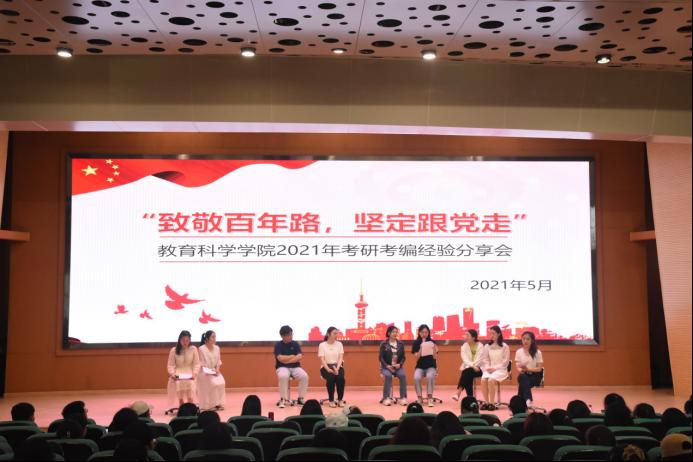 首先进行的是考研分享会。考取江苏师范大学的1701班施天倩就英语和政治,向大家分享自己的经验,她建议要保持英语语感,学会自己总结题型。政治的备考不用过早地开始,要结合题型来巩固知识点。1707班邵莹莹已被杭州师范大学录取,她对专业课的复习提出了自己的建议:要形成自己的知识体系,不能死记硬背知识点,要有自己的思考。1701班张雪笑笑和钱淼考研考编均成功,在复习策略上张雪笑笑认为,对于考点要做到全面的把握,最好整理出整体框架,并要根据心仪学校的题型确定背诵重点。在生活作息上钱淼提出三条建议:一是保持良好的运动习惯;二是制定阶段目标;三是注意劳逸结合。在选择专业、院校方面,考取江苏师范大学的1710班杨宇鹏和考取上海师范大学的1710班王鑫雨提到,要量力而行,选择合适自己的;另外杨宇鹏还提到,在考研过程中,会面临是否考编、考公的选择,要慎重决定。考研的道路是漫长而痛苦的,考取大连医科大学的1709班金鑫鑫送给在场同学们两句话:一是只要下定决心,宇宙中所有力量都会推你前行;二是慢慢来,比较快:不要轻易和别人比较,要有自己的复习节奏。考取南京师范大学的1709班赵丽萍告诉大家,考研备考过程中一定要坚持学,积少成多;要保证高效的学习,每天以饱满的精力投入到有效的学习中。