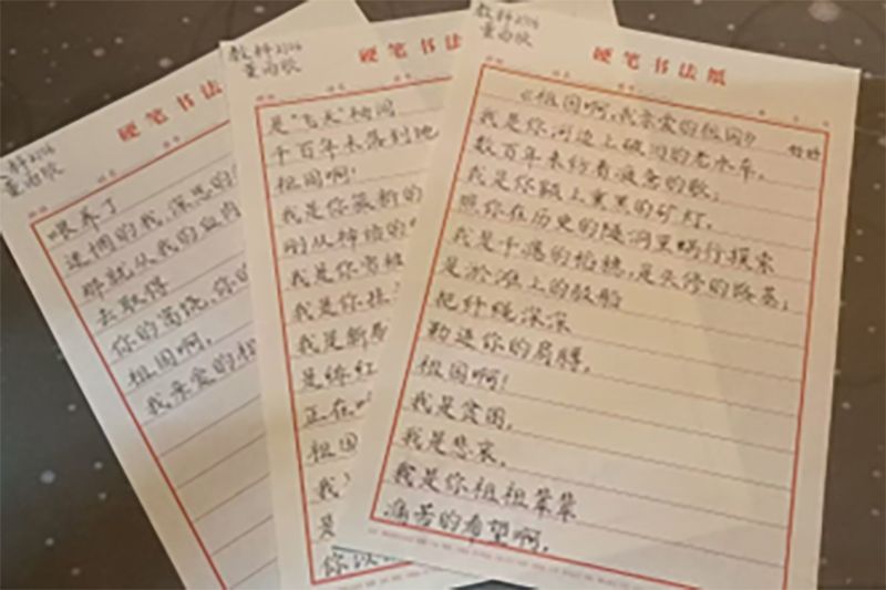 本次活动,同学们皆投入了极大的热情,积极报名参加,这次展出的作品,内容丰富,形式多样,书法作品或苍劲有力,或隽永飘逸,或清秀雅致,充分展示了同学们的书法专业技能,同时为注入了爱国之情。