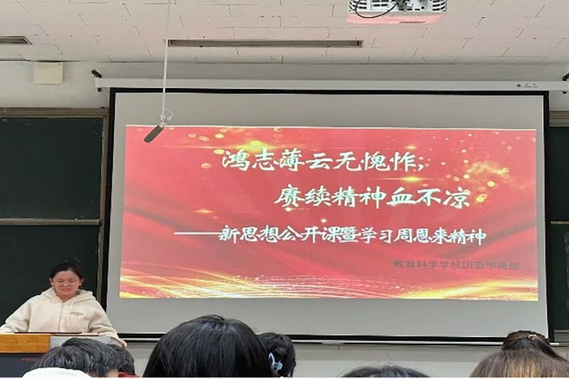 教科网11月9日电(记者 解博 周柯柯)为了巩固党的二十大召开成果,响应国家“青马工程”建设的号召,陶冶当代大学生的爱国情怀,弘扬周恩来精神,royal皇家88平台共青团教育科学学院团委学周部于崇文楼阶梯103教室召开“鸿志薄云无愧怍,赓续精神血不凉”新思想公开课暨学习周恩来精神信仰公开课。