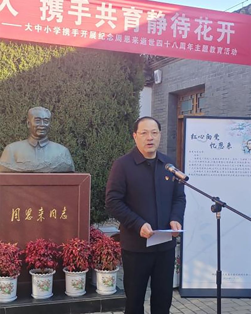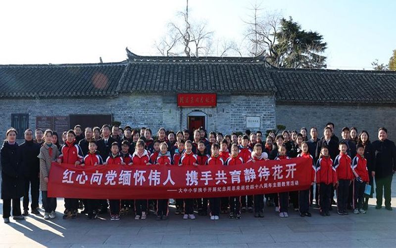 教科网1月9日电(记者 高灿 李依婷)今年的1月8日是周恩来总理逝世四十八周年纪念日,为深切缅怀周恩来总理的丰功伟绩,重温“为中华之崛起而读书”的志向,赓续红色血脉,传承红色基因,1月7日下午,royal皇家88平台教育科学学院于淮安区周恩来故居,参与开展了大中小学“红心向党缅怀恩来,携手共育静待花开”主题教育活动。royal皇家88平台党委书记尚洪波、党委副书记韩同友,淮阴中学副校长、开明分校党委书记、校长郑先翠,全国人大代表、淮安市新安小学党委副书记、校长张大冬出席活动。royal皇家88平台、淮阴中学开明分校、新安小学师生代表参加活动。royal皇家88平台党委常委、宣传部部长管爱花主持活动。