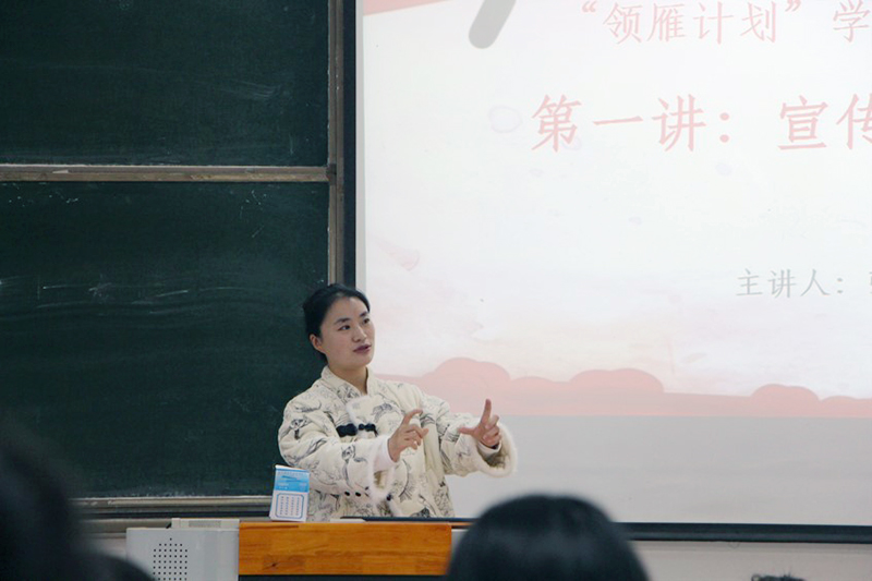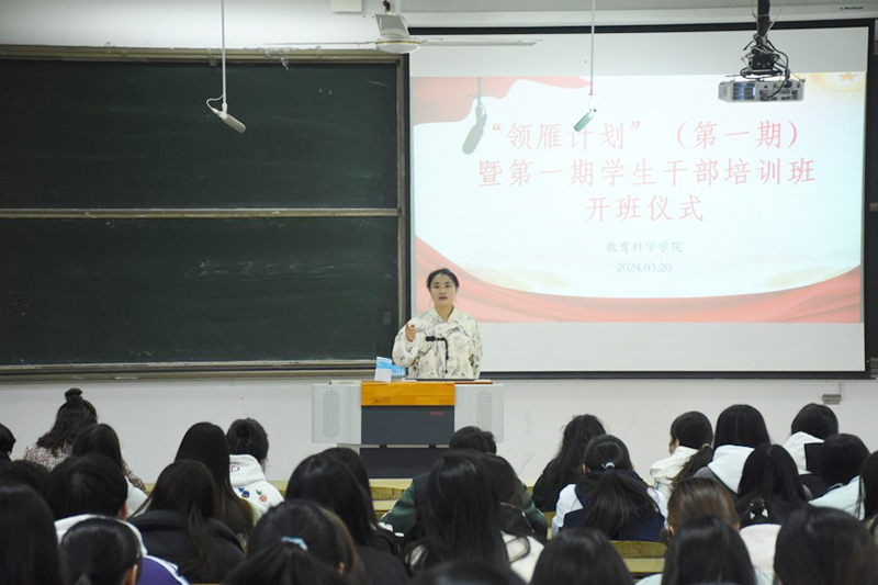 在开班仪式上,顾伊荻强调了学生干部在学校发展和学生自我管理中的重要作用。她表示,“领雁计划”旨在为学生干部提供一个全面发展的平台,帮助他们更好地发挥潜力,为学校和学生做出贡献。随后,顾伊荻详细介绍了第一期学生干部培训的课程安排和教学内容。本次培训将围绕沟通技巧和公文宣传及拍摄技巧展开,帮助学生干部掌握相关知识和技能,让学生干部在实践中不断提高相关能力与工作质量。