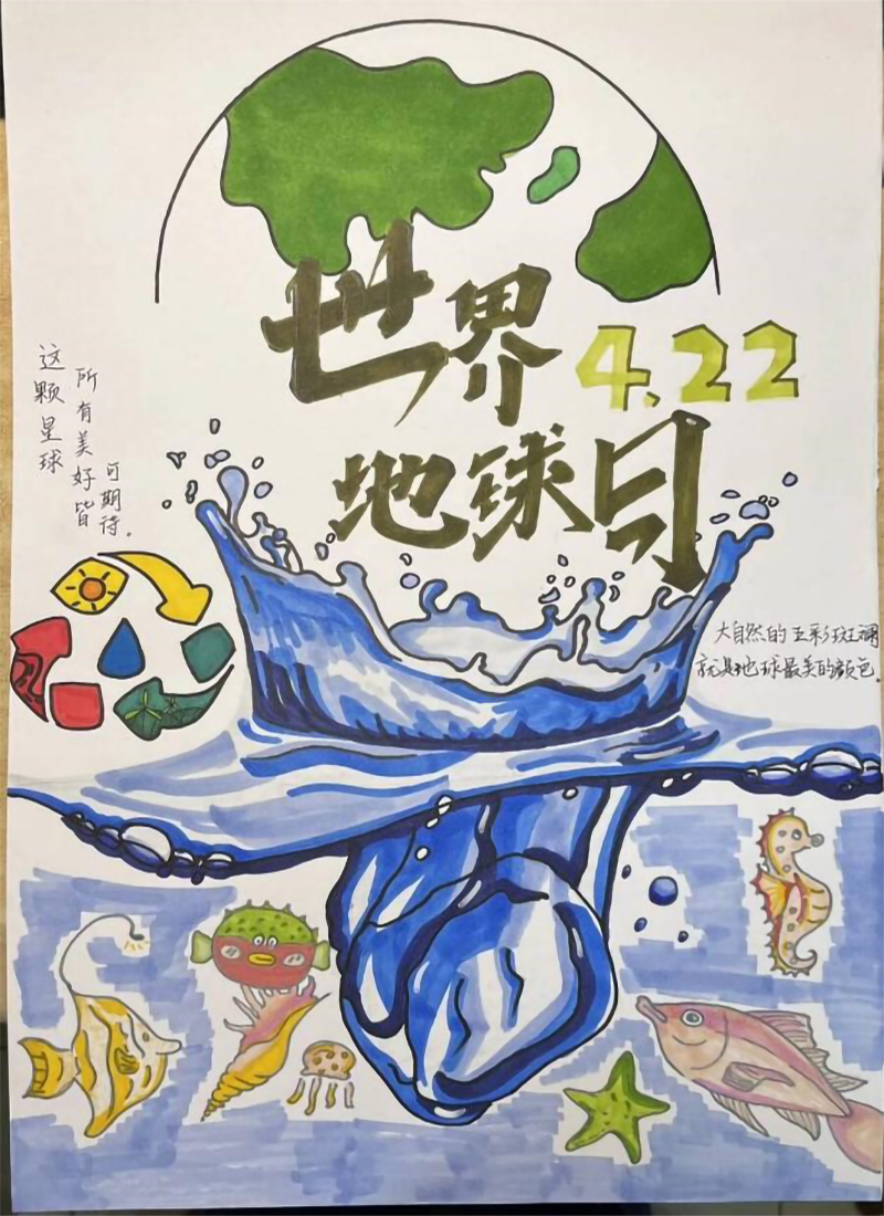 在活动期间内,同学们带着对自然环境的热爱与保护地球环境的信念,围绕主题背景“世界地球日”开展了创作,将大自然的美好与如何保护环境相融合,创作出了一幅幅精美的作品。