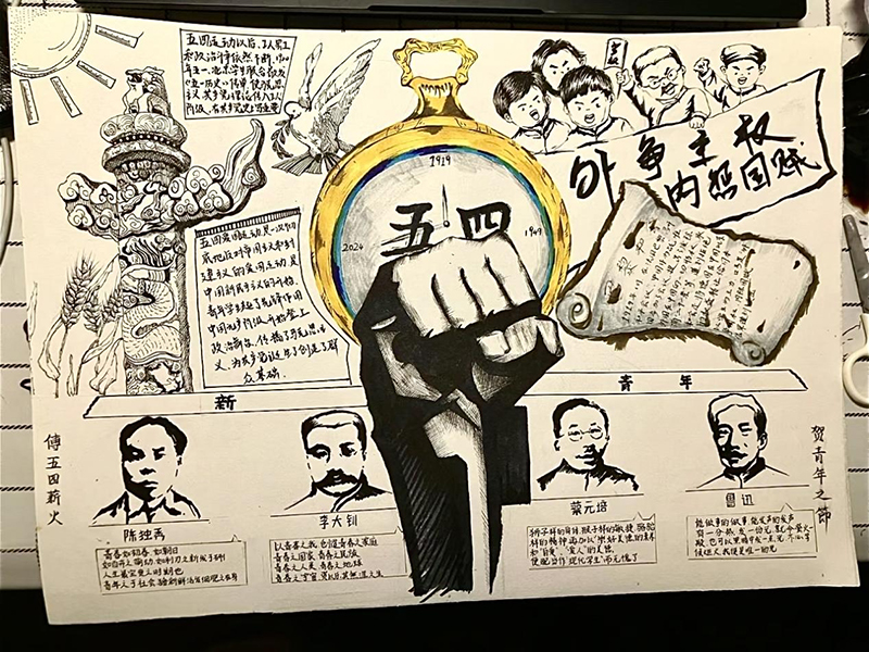 同学们围绕“五四运动”这一历史节点,以征文和绘画的形式,展现了自己对五四精神的理解和感悟。他们发挥丰富的想象力和创造力,将五四精神融入作品之中,用文字和画笔描绘出了一幅幅生动而深刻的画面。