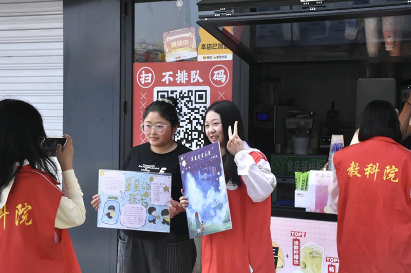 在活动开始之前,教育科学学院学生会志愿服务部面向教科院全体同学征集了与关爱特殊儿童有关的海报,同学们踊跃参加,一幅幅精美又不乏深度的海报呈现出来,并由志愿者带上街头,向大众介绍宣传。活动开始之后,志愿者们辅助博爱康复中心、自闭症儿童中心老师上课,为孩子们辅导作业、教他们画画、唱歌等技能。渐渐地,初次见面的尴尬慢慢消失,取而代之的是孩子们的笑脸和欢声笑语。