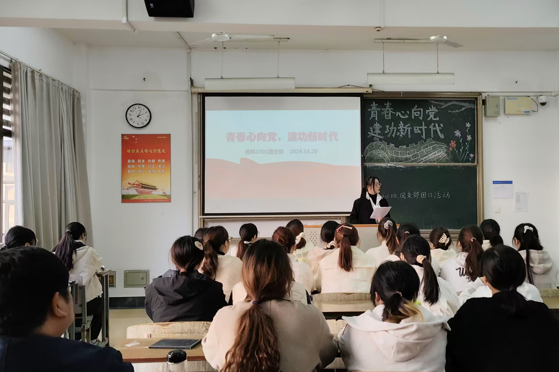活动伊始,团支书介绍班级整体情况,并以习近平总书记在2014年“五四”青年节在北京大学考察时对青年自觉践行社会主义核心价值观提出的殷切期望为引言拉开帷幕。接着,团支书在通过ppt,在第一部分“在勤学中夯实知识根基”展示了教科2301班同学日常的学习情况和实践情况,并对整体情况做出表扬。随后,邀请同学上台,分享关键词,展现了同学们积极奋发的心态,团支书在同学分享后对未来的学习生活进行引导与做出勉励。随后,在第二部分“自我提升夯实青春力量”中,团支书首先展示了教科2301班同学的四六级通过率、入党情况、校级院级任职情况等,展现了一个积极向上的班集体,体现了拼搏进取的班级氛围。接着,团支书展示了教科2301班同学的教师技能训练情况,并以视频的形式让所有同学都能看到过去的回忆,看见自己的成长。在视频播放后,团支书提出问题,希望同学们分享在日常学习生活或工作任职的期间遇到的困难以及最终是如何解决的,同学们积极举手发言,团支书对同学们的发言进行总结。接着,在第三部分“在明辨中找准青春方向”中,团支书通过对同学们在校期间的表现,引导同学们写下了对于两年后的自己的期望,并将纸条收集,在两年后再发回同学手中。同时,向同学们提问每一个人的青春梦想是什么,对于实现青春梦想有什么样的计划,并组织了3分钟的小组讨论,接着请同学上台分享了自己的青春梦想,团支书进行总结并勉励。