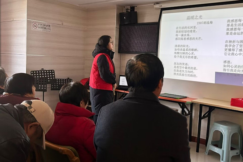 活动现场,志愿服务部的志愿者为星光社区的老人们带来了一场特别的“感恩”主题原创诗歌朗诵会。他们用声情并茂的朗诵,讲述了关于感恩的动人故事,深入浅出地表达了他们对感恩的多元理解和深刻感悟。老人们听得津津有味,脸上露出了欣慰的笑容。