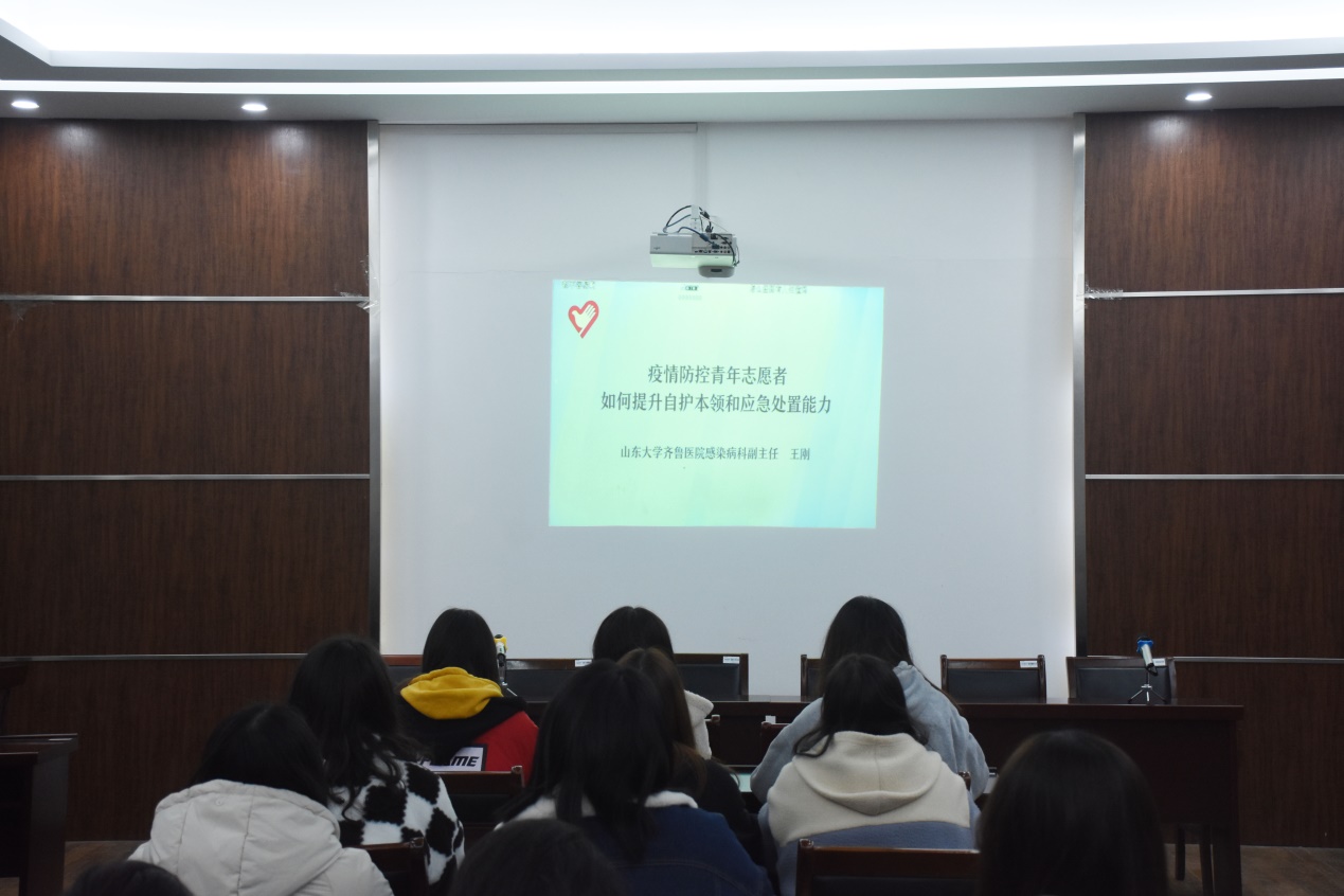 在本次培训直播中,山东大学齐鲁医院感染病科副主任王刚介绍了疫情防控的相关知识,从当今全球抗疫的整体情形切入,着重与疫情防控志愿者分享了应如何提升在防疫志愿服务活动中的自护能力和应急处理能力。培训全程严格按照疫情防控的相关要求,到场的学生骨干志愿者全员佩戴口罩,分散就坐,认真听讲,明确工作目标,切实提高认识。