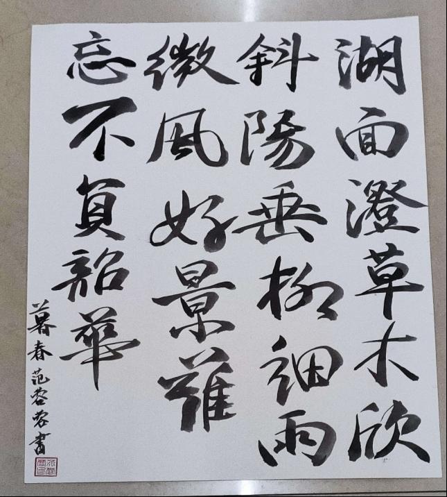 经过为期一周的线上征集,活动取得了满意成效。许多同学踊跃参与其中,共赴这场春日之约,以多种多样的形式表达了自己对春分时令的体悟。如书法、诗歌等形式,提交的作品各具特色、情感真挚丰富。图为范蓉蓉同学的书法作品。书法苍劲有力,书写时行云流水,以自己的感悟,为我们描绘了,她对春日风景的一番体验。而周一凡同学的小篆,处处流露出其深厚的书法功底,他自创的三行诗首句,夫春水漾百花芳,以细腻的笔触,勾勒出春水之柔,百花之艳,为我们展示出了一副明媚又柔和的春景。而张琪同学,又用饱满的声音,为我们朗诵了一篇诗赋,以另一种方式抒发了自己对这明媚春日的感情。