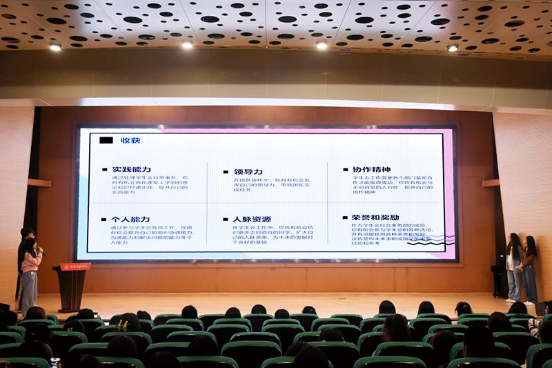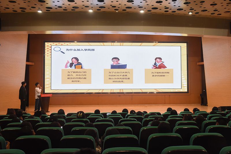 学生会综合事务部、志愿服务部、自管会行政综合部、学风部及团委综合事务部、创新事务部等三十三个学生部门运用视频、PPT等多种形式为新生们介绍了各自部门的职能、招新要求以及加入部门之后可能的收获。为了吸引更多的学生加入到自己的部门,各部门在招新中融入了许多才艺表演,如唱歌、长笛、舞蹈等,把现场的活动气氛推向高潮。与此同时,各个部门的部长们热情询问新生们的意向,积极邀请新生加入并细致地为他们答疑解惑。