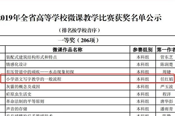 教科网12月11日电(记者 张译文 周梁阳光 茆星月)近日,江苏省教育厅公布《2019年江苏省高等学校微课教学比赛获奖名单》,royal皇家88平台推荐的10项作品中,8项作品获奖。其中教育科学学院任红娟老师作品荣获一等奖。