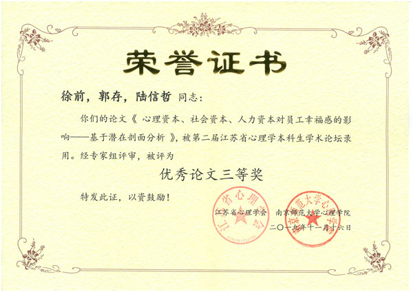 最终,教科院周锋涛的《奖赏预期对场景情绪加工的影响:一项事件相关电位研究》论文荣获优秀论文一等奖,吴丽娟和徐前同学分别以《大学生催眠认知影响因素的实证研究》和《心理资本、社会资本、人力资本对员工幸福感的影响——基于潜在剖面分析》为题的论文荣获优秀论文三等奖。