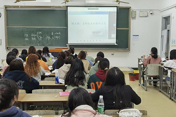 此次交流会分为两个部分。顾老师先谈及了自己的成长历程,他将自己的职业成长历程分为“还行,踏上了教育的行程”“还好,教科研有了尝试”“挺好,在努力中提升”“真好,在坚持中收获”和“好呀,在服务中同行”五个阶段,结合自己不同阶段的付出以及取得的成就告诉大家:新教师要能够坚持初心,坚定信心,抓住机会,做好本职,努力提高职业修养。并且引用“是故学然后知不足,教然后知困。知不足,然后能自反也;知困,然后能自强也。”来激励同学们苦练师范生基本功,为将来走上教师岗位打好基础。随后,顾老师向同学们讲述了自己的“小学数学深度教学”教学主张,通过列举不同的事例告诉大家:教师在平时的教学活动中要能懂得灵活变通,教学要具有深度。最后,老师总结强调,在同学们日后的教学工作中,教师应对学生、知识和教学方法等多加关注。