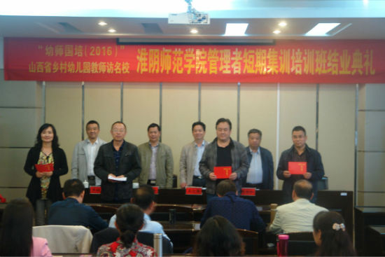 幼师国培(2016)山西省乡村幼儿园教师短期集训培训班经过15天的学习,44名参训学员全部合格结业。结业典礼于10月22日下午在淮阴师院师苑宾馆会议室举行。出席仪式的领导有继续教育学院院长王之国、教育科学学院党总支书记周友士、继续教育学院党总支书记韦相和、继续教育学院副院长牛树青、班级学习和生活相关管理老师。典礼仪式由王之国主持。
