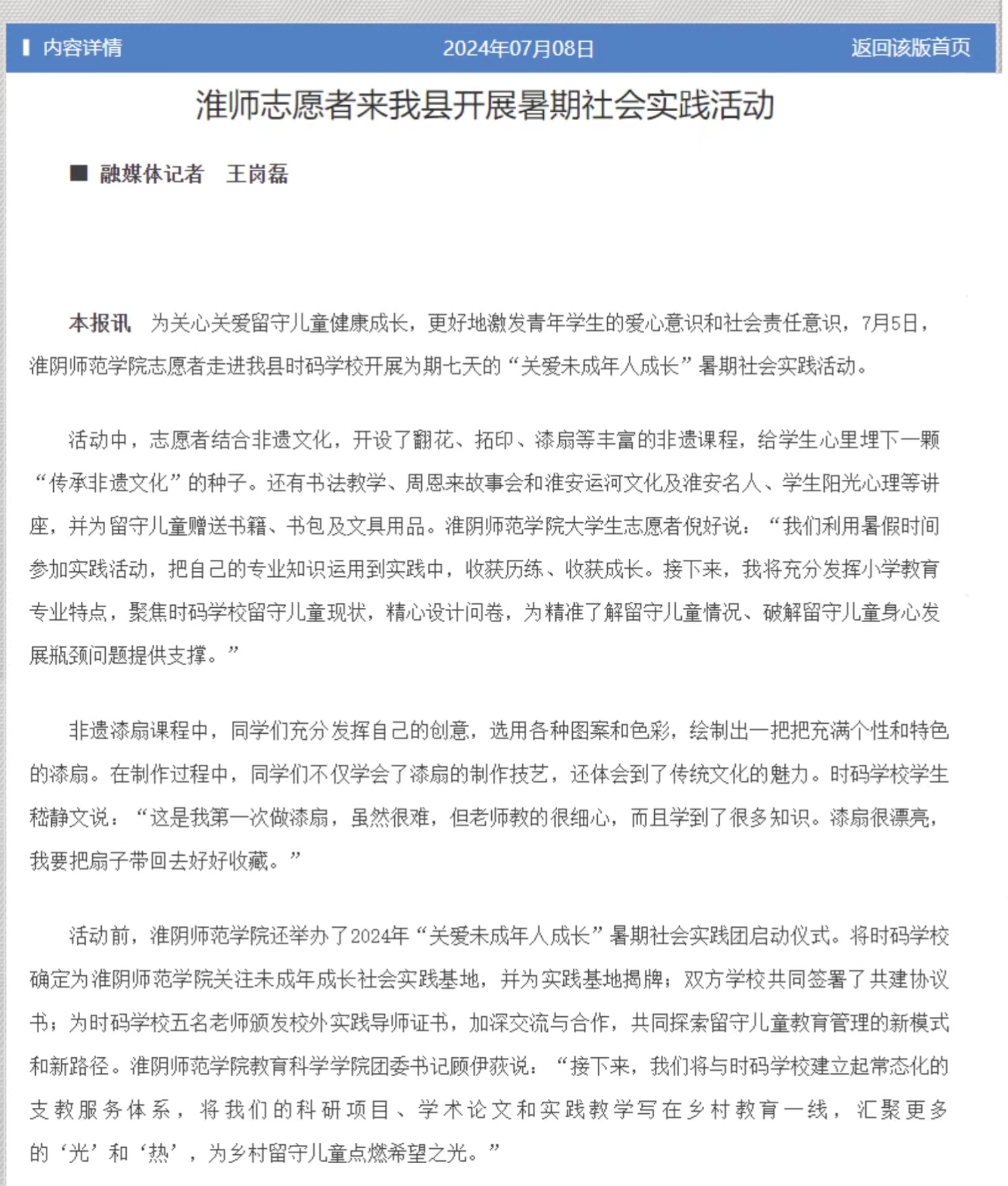 【涟水日报】淮师志愿者来我县开启暑期社会实践活动